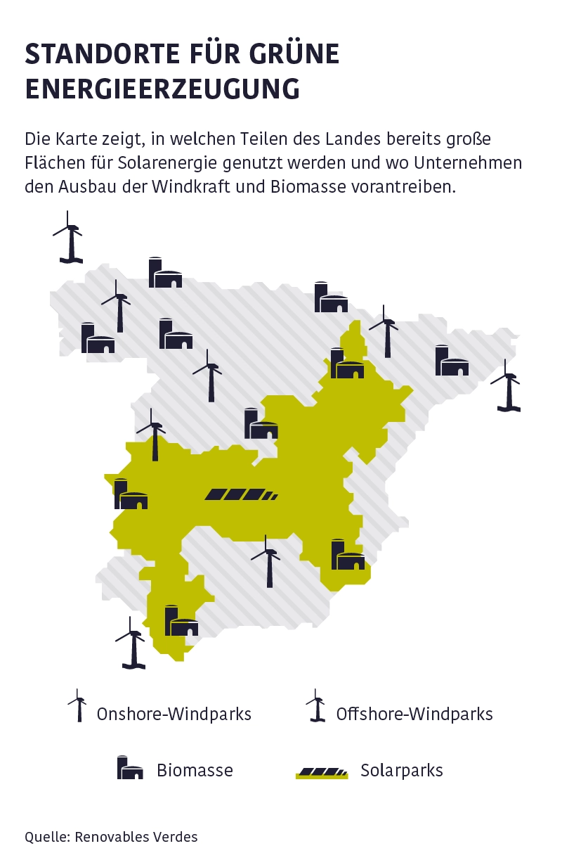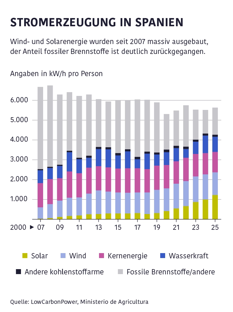 Etwa 60 Prozent des Strombedarfs deckt Spanien aus erneuerbaren Energien, an manchen Tagen sind es sogar bis zu 100 Prozent. Grüner Strom wird vor allem aus Sonne und Wind erzeugt sowie aus Wasserkraft. Über 300 Sonnentage und windreiche Küsten sind perfekte Bedingungen für Windkraft und Photovoltaik. Seit der Jahrtausendwende wird ihr Ausbau massiv vorangetrieben. 2004 startete eine Solaroffensive und Agrarflächen wurden zu Solarstromfeldern. Durch die globale Finanzkrise und den Sparzwang einige Jahre später stockte der Ausbau zwar; ab 2018 nahm er wieder Tempo auf. Bis Mitte 2023 haben sich die Kapazitäten der Solarkraftwerke fast verfünffacht. An den Küsten und im Landesinneren entstanden kleine und große Windparks. 2022 lag die installierte Leistung bei knapp 30.000 Megawatt. Bis zum Jahr 2030 soll sie auf 62.000 Megawatt ausgebaut werden. Die installierte Leistung der Windkraft ist nach Deutschland die zweithöchste in Europa.
