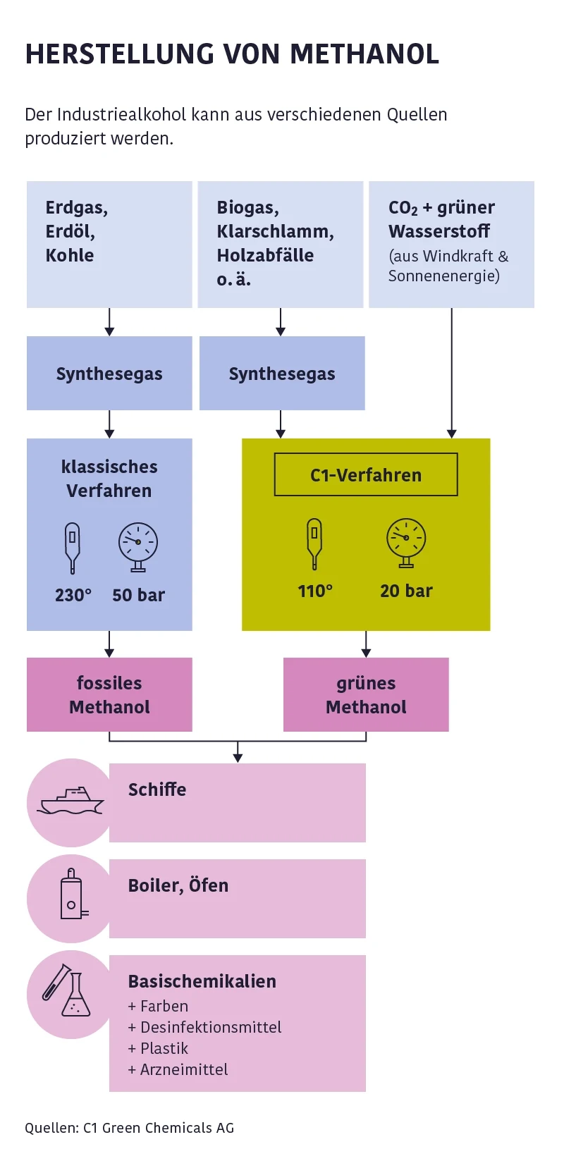 Als Rohstoffe für das klimafreundliche Methanol dienen grüner Wasserstoff und CO2 – oder vergaste Biomasse wie Klärschlamm, Gülle und Holzabfälle. „Gerade für Europa ist der Weg über Biomasse besonders attraktiv. Er macht uns unabhängiger von fossilen Energieimporten und kommt ohne teuren grünen Wasserstoff aus“, so Vollmann.