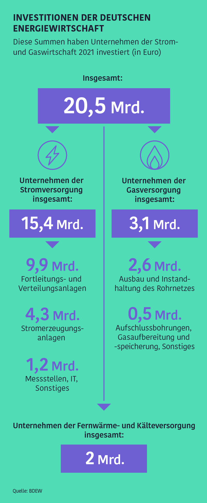 Kaum eine Industriebranche in Deutschland investiert so viel Geld wie die Energiewirtschaft – im Jahr 2021 die Rekordsumme von 20,5 Milliarden Euro. Dabei fließt der größte Teil dieser Summe in den Ausbau der Netze: Fast 10 Milliarden Euro haben Unternehmen der Stromwirtschaft 2021 allein für „Fortleitungs- und Verteilungsanlagen“ aufgewendet, weitere 4,3 Milliarden Euro für Erzeugungsanlagen. Dazu kommen Ausgaben der Gaswirtschaft von rund 3 Milliarden Euro – vor allem fürs Rohrnetz – und 2 Milliarden Euro, die 2021 in die Fernwärme- und Kälteversorgung investiert wurden. Wie die Infografik zeigt: Die Zukunfts- und Innovationsprojekte der Branche setzen an den verschiedenen Schlüsselstellen des Energiesystems an, sind mal kleinere, mal größere Rädchen im komplexen Getriebe der modernen Versorgungslandschaft . Ein Blick auf fünf Investitionsbeispiele von Nord bis Süd: von der Erzeugung bis hin zur Ladesäule, von der Projektskizze bis zur Umsetzung.