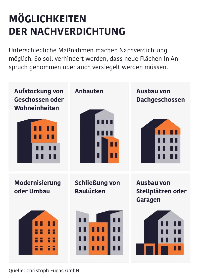 Nicht zuletzt kann Nachverdichtung Städte auch lebenswerter machen. Begrünte Dächer und Fassaden verbessern das Mikroklima, neue Grünflächen und Frischluftschneisen mindern Hitze-Hotspots. Regenwasser kann gesammelt und genutzt werden, Photovoltaik auf Dächern und Fassaden liefert Strom für Wärmepumpen oder Quartiersspeicher. Im Idealfall wird so aus der (Wohnungs-)Not eine Tugend.