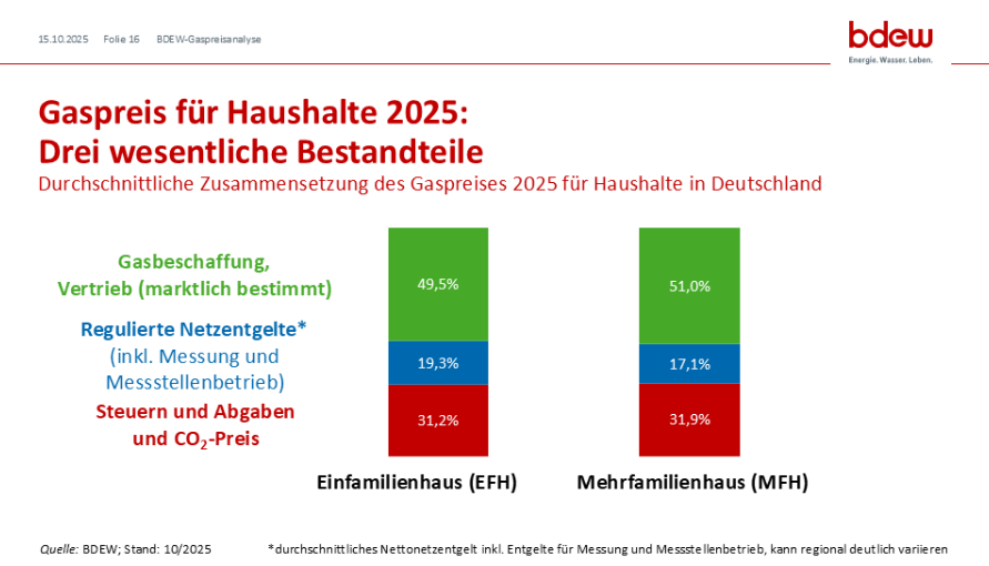 Beschaffung und Vertrieb: Dies sind die vom Gaslieferanten grundsätzlich zu beeinflussenden Preisbestandteile. Ihr durchschnittlicher Anteil am Gaspreis für Haushaltskunden liegt 2025 (Stand: 10/2025) bei Einfamilienhäusern (EFH) bei 50 Prozent und bei Mehrfamilienhäusern (MFH) bei 51 Prozent.