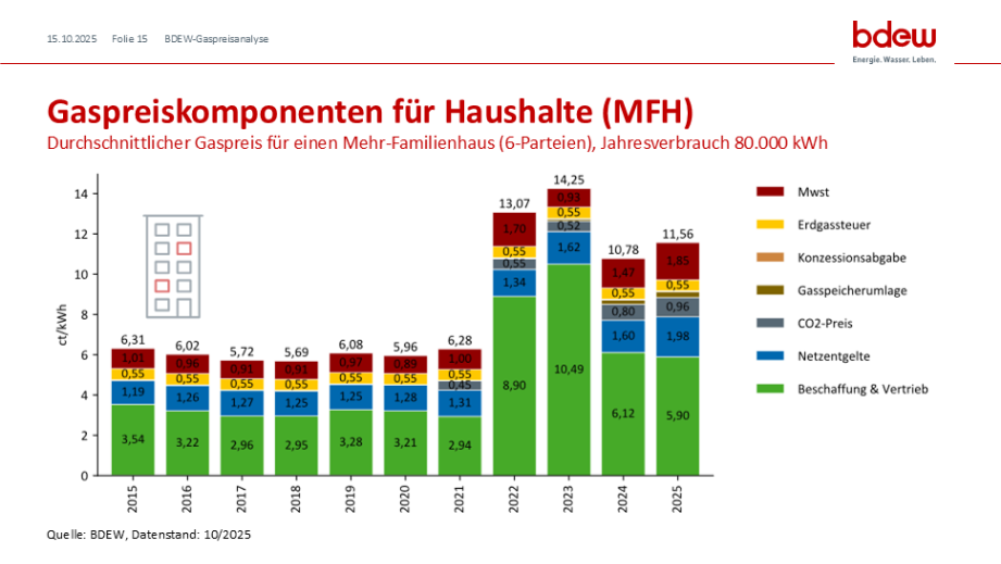 Auch bei Haushalten in Mehrfamilienhäusern ist dieser Trend sichtbar: Der durchschnittliche Erdgaspreis für Haushalte in Mehrfamilienhäusern (MFH) mit einem Jahresverbrauch von 80.000 kWh beträgt aktuell 2025 durchschnittlich 11,56 ct/kWh und bewegt sich damit ebenfalls etwas oberhalb des Vorjahresniveaus.