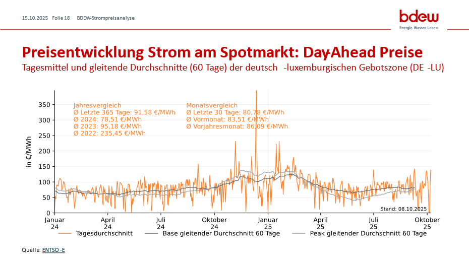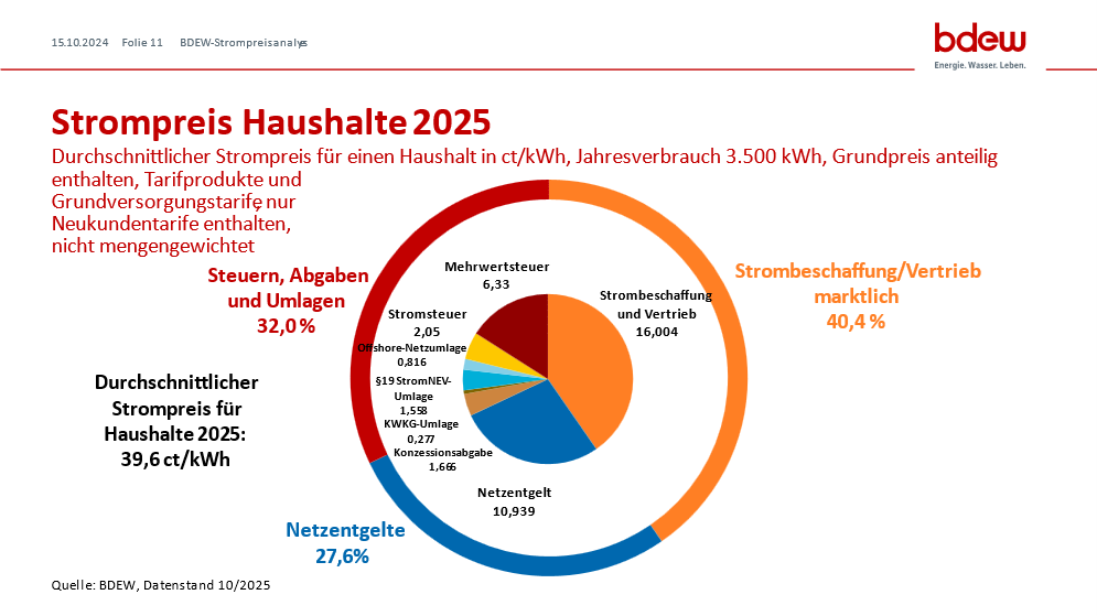 Der durchschnittliche Strompreis für Haushalte ist im derzeitigen Mittel für 2025 im Vergleich zu 2024 um 0,6 ct/kWh gesunken und beträgt nun durchschnittlich 39,6 ct/kWh (Grundpreis anteilig für einen Verbrauch von 3.500 kWh/a enthalten). Steuern, Abgaben und Umlagen für Haushaltskunden betragen derzeit 12,7 ct/kWh und sind gegenüber 2024 um einen ct/kWh gestiegen. Dies entspricht 32 Prozent des Gesamtpreises. Die Netzentgelte inklusive der Kosten für Messung und Messstellenbetrieb liegen derzeit für 2025 durchschnittlich bei 10,9 ct/kWh und damit 0,5 ct/kWh unter dem Vorjahresdurchschnitt. Ihr Anteil am Gesamtpreis beträgt damit rund 28 Prozent. Die Kosten für Beschaffung und Vertrieb haben sich im Vergleich zum Durchschnitt des Vorjahres um 1,1 ct/kWh verringert und bilden mit 16,0 ct/kWh rund 40 Prozent des Gesamtpreises ab.