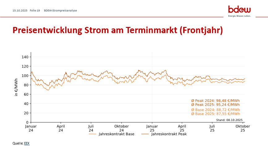 1) Kosten für Strombeschaffung, Vertrieb, Service und Dienstleistungen des Lieferanten: Dies sind die vom Stromlieferanten grundsätzlich zu beeinflussenden Preisbestandteile. Ihr durchschnittlicher Anteil am Strompreis für Haushaltskunden liegt 2025 bislang bei rund 40 Prozent. (Stand: 10/2025)